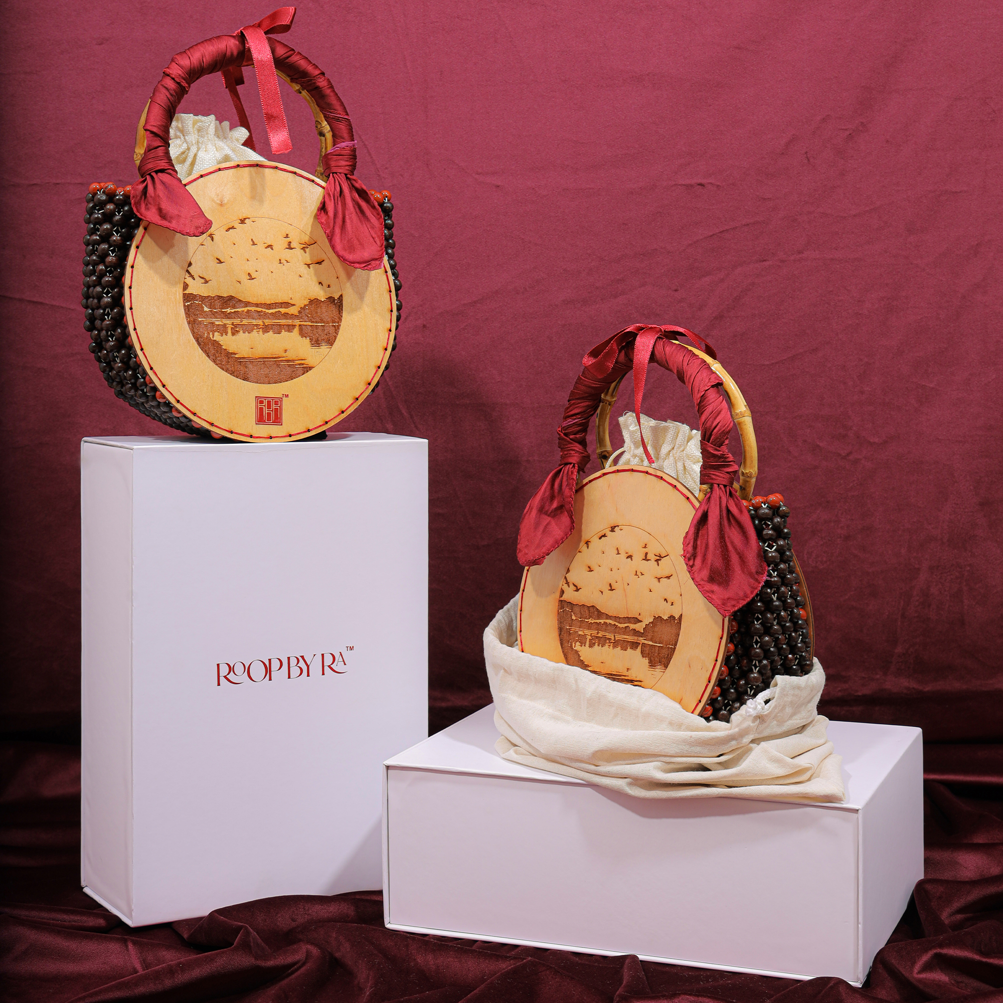 - Handles: Polished Bamboo Adorned with Red Silk